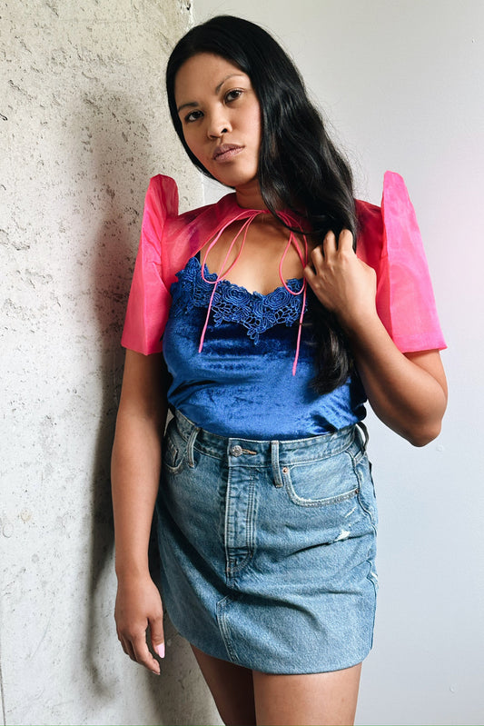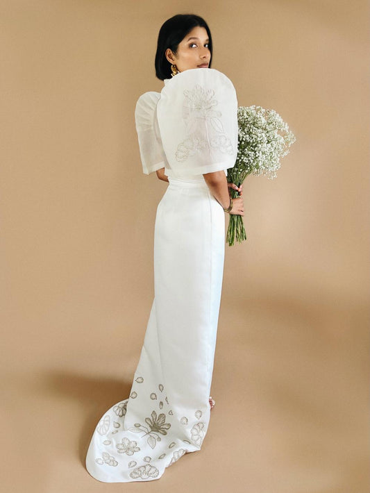 Banaba Flower High Neck Pleat Front Camisa and Saya De Cola