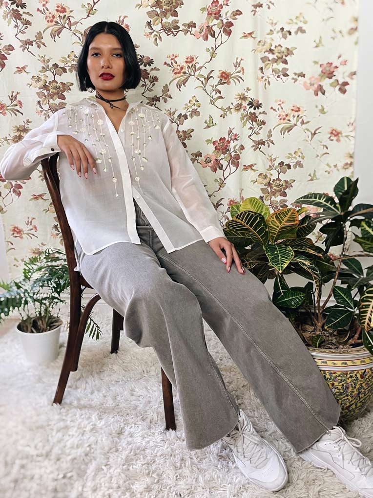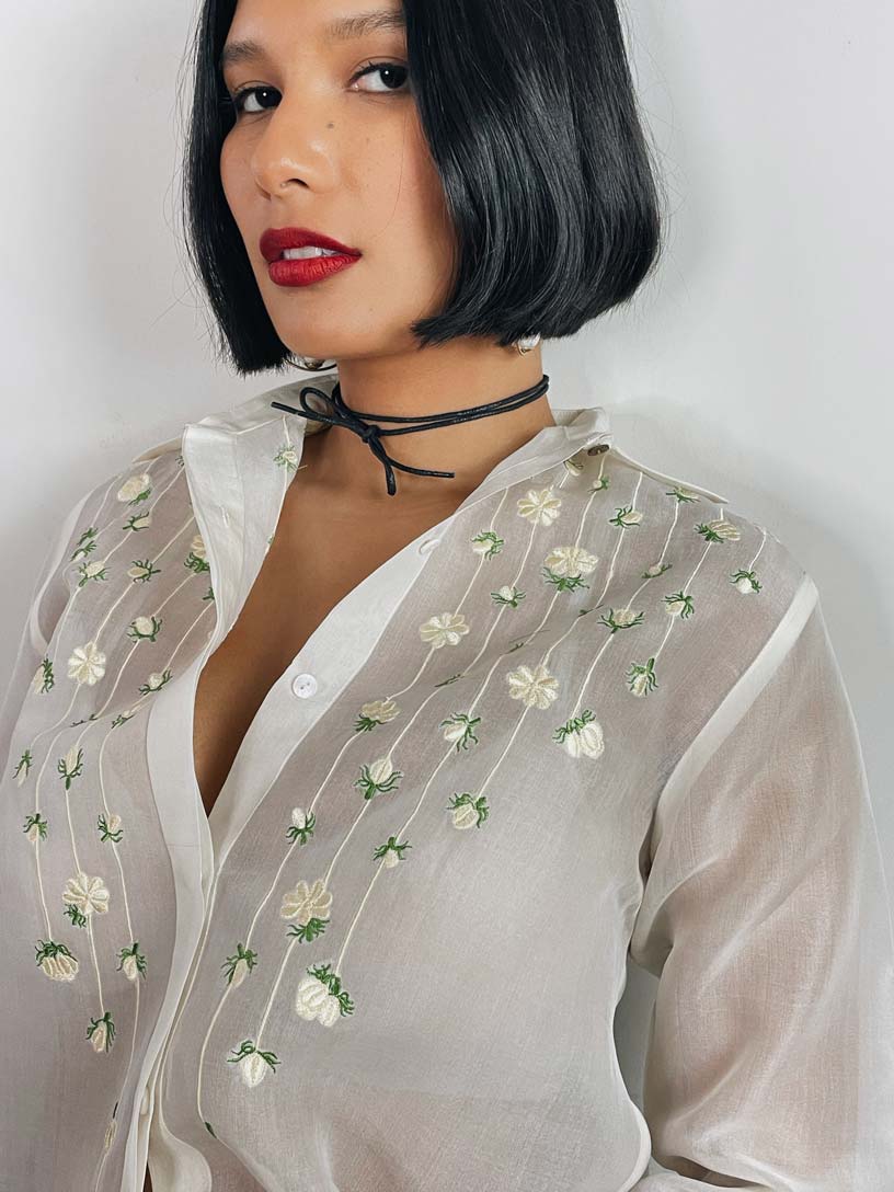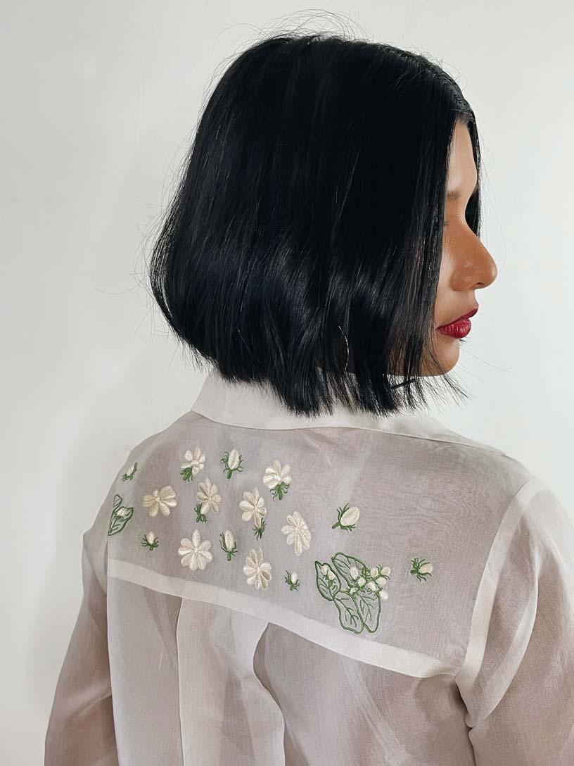 The Boyfriend Barong is back! This relaxed fit, menswear inspired, women’s barong was originally released in 2017. We are bringing it back with our own exclusive sampaguita garland embroidery design (with coloured thread!) at the front in a V shape and at the back yoke. The national flower on the national garment, makes so much sense, no?